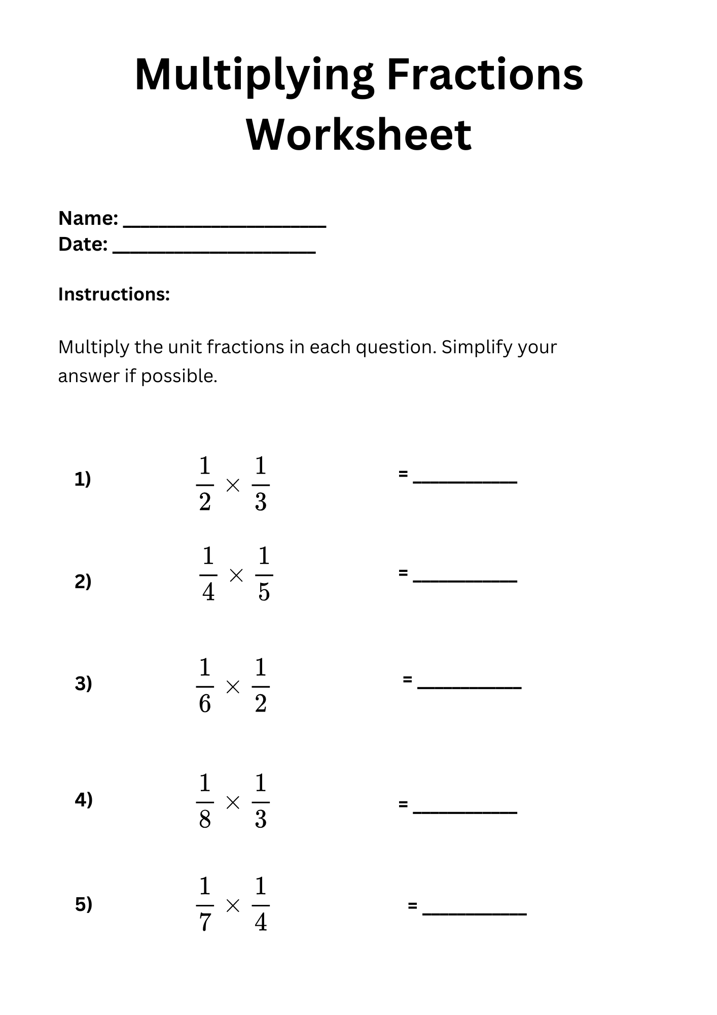 A Multiplying Fractions Worksheet is a structured learning resource designed to help students practice and master the concept of multiplying fractions. These worksheets include a variety of problems, ranging from simple fraction multiplication to complex word problems involving mixed numbers and improper fractions. With step-by-step exercises, students can develop accuracy and confidence in solving fraction multiplication problems.
